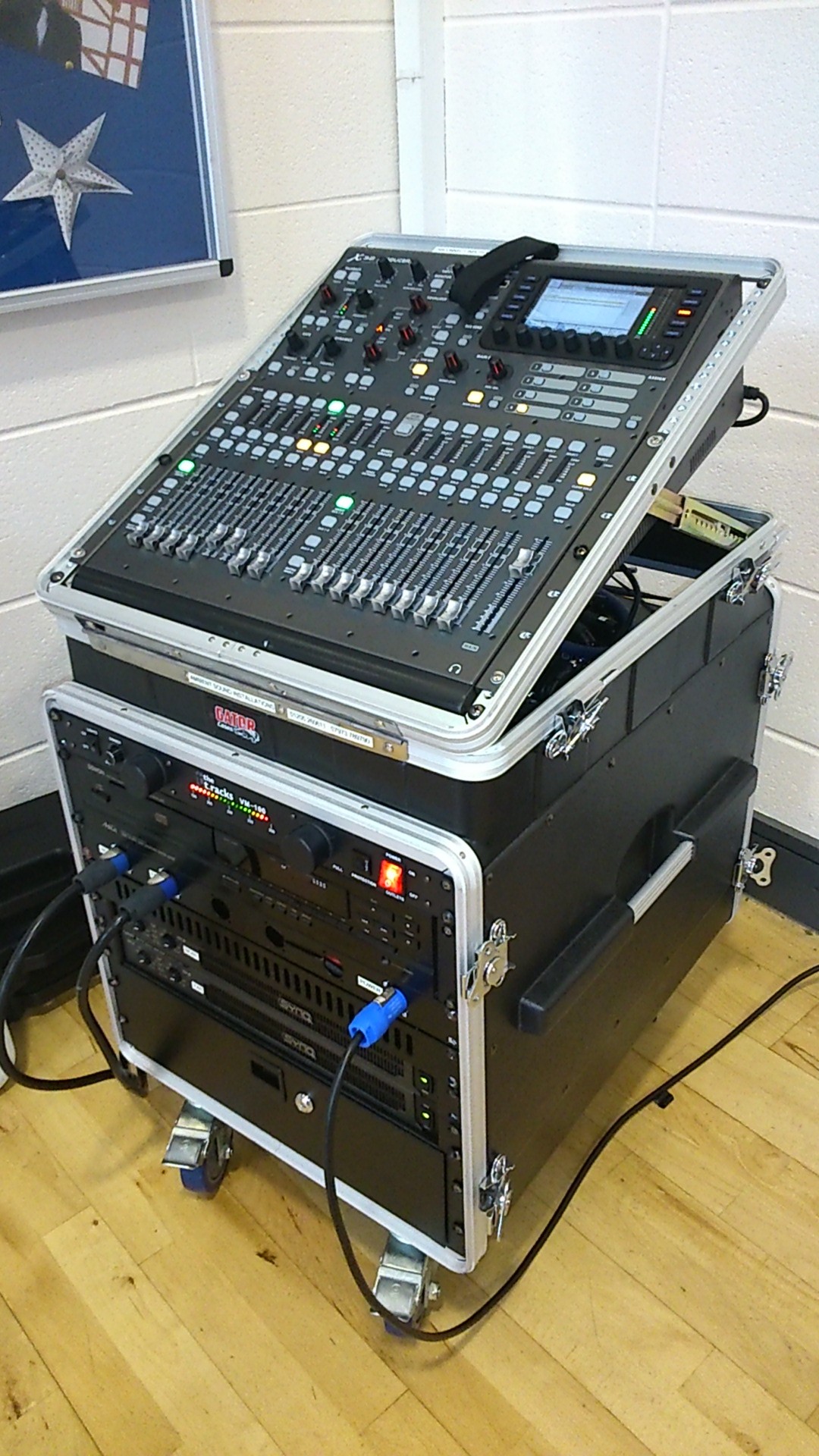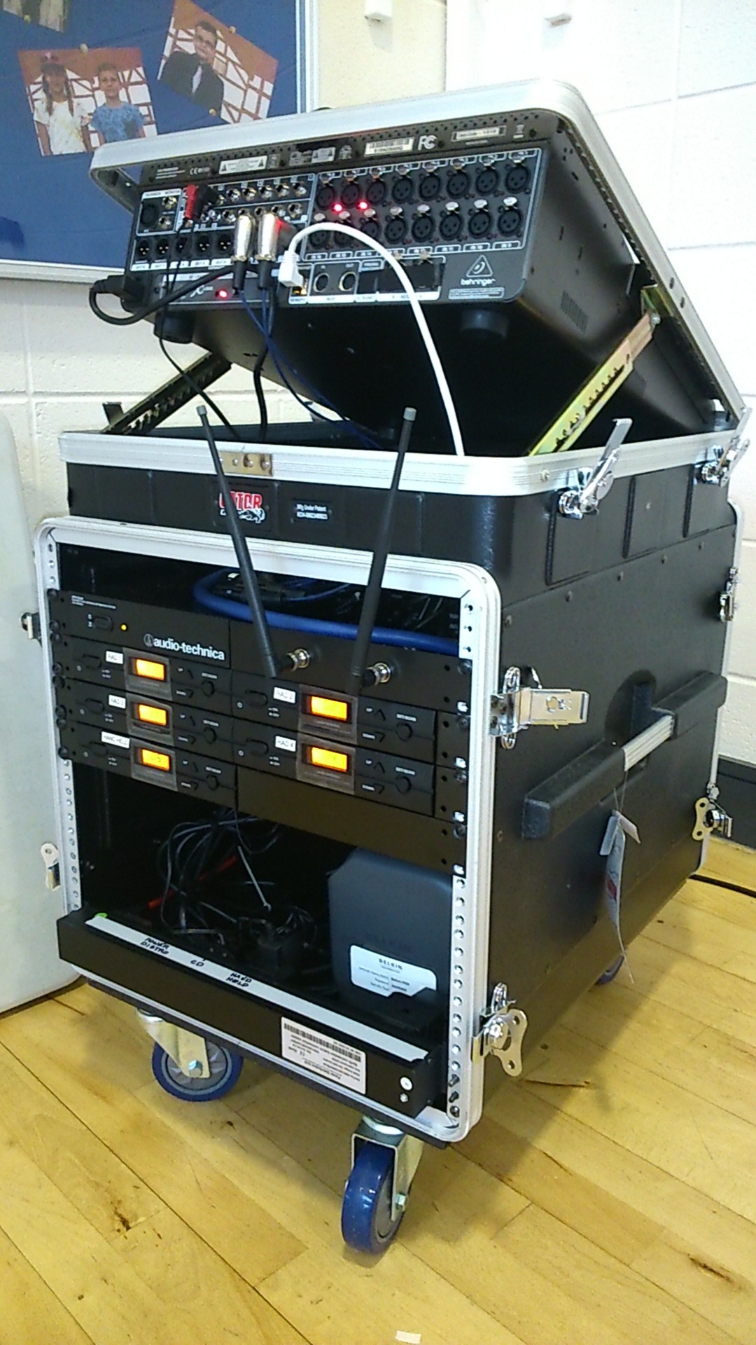 Behringer X32 Producer Digital Sound mixer / 5 x Audio Technica Radiomic receivers / 2 x Synq Digit Amplifiers / CD Player / Microphone Store Drawer.